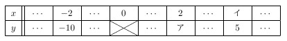 下の表で,\( y \)が\( x \)に反比例するとき,空白ア,イに当てはまる数を半角英数字で入力しなさい。