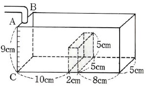 次の図のように,水をさえぎるための直方体のしきりが入った直方体状の容器が,水平に置かれています。