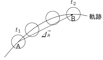 上の図のように,ある時刻$t_1$に位置Aにあった物体が,時刻$t_2$に位置Bに移動したとき,平均の速度$\overrightarrow{v}$は,時刻$\Delta t =t_2 -t_1$における変位を$\Delta \overrightarrow{s}$とすると,