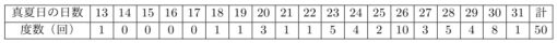 下の表は,A市における1967年から2016年までの50年間の8月の真夏日(1日の最高気温が30度以上の日)の日数を調べて,度数分布表に整理したもので,その平均値は$25.64$日です。また,A市における2017年の8月の真夏日の日数は30日でした。