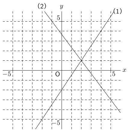 下の図の直線(1),(2)は,それぞれある1次関数のグラフになります。これらの関数の式を求め,ア~キに当てはまる数を半角英数字で入力しなさい。ただし,$\displaystyle -\frac{1}{2}$のような分数は,$\displaystyle \frac{-1}{2}$のように分子に符号を含む形で入力すること。