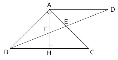 図で,$\triangle{\text{ABC}}$は,$\angle{\text{BAC}} =90^{\circ}$の直角二等辺三角形です。Dは$\angle{\text{ABC}}$の二等分線上の点で,$\text{AD} // \text{BC}$となっています。Hは辺BC上の点で,$\text{AH} \perp \text{BC}$であり,E,Fはそれぞれ線分DBとAC,AHとの交点です。
