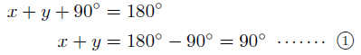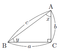 次の図のように,直角三角形の直角をはさむ2辺の長さをa,b,斜辺の長さをcとし,∠A=x,∠B=yとします。