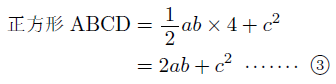 以上のようにして,正方形ABCDの面積を2つの方法で表すことができたので,②,③より,