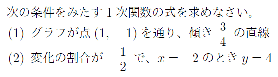 次の条件をみたす1次関数の式を求め,ア~オに当てはまる数を半角英数字で入力しなさい。ただし,$\displaystyle -\frac{1}{2}$のような分数は,$\displaystyle \frac{-1}{2}$のように分子に符号を含む形で入力すること。