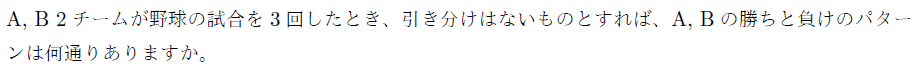 A,B2チームが野球の試合を3回したとき,引き分けはないものとすれば,A,Bの勝ちと負けのパターンは$\fbox{ア}$通りあります。