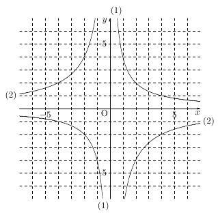 グラフが次の図の(1),(2)のような双曲線になるとき,\( y \)を\( x \)の式で表し,ア~エに当てはまる数を半角英数字で入力しなさい。ただし,\(\displaystyle -\frac{1}{2} \)のような分数は,\(\displaystyle \frac{-1}{2} \)のように分子に符号を含む形で入力すること。