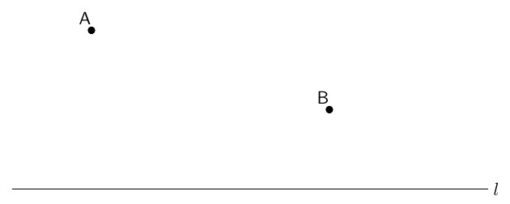 下の図のような2点A,Bと直線\( l \)があります。直線\( l \)上に点Pをとって,\( \text{AP} =\text{BP} \)となるようにしたいと思います。点Pを作図しなさい。