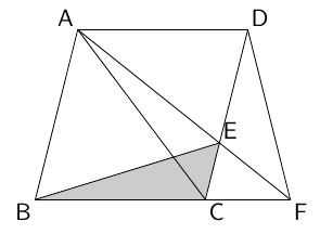次の図で,$\text{AB} // \text{DC}$,$\text{AD} // \text{BF}$であるとき,△BCEと面積の等しい三角形を下から2つ選び,ア,イに当てはまる数を半角英数字で小さい順に入力しなさい。