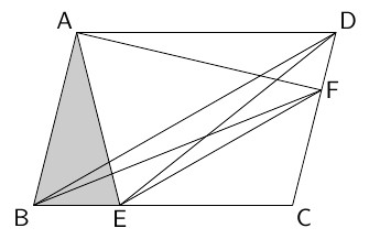 次の図で,$\text{AB} // \text{DC}$,$\text{AD} // \text{BC}$,$\text{EF} // \text{BD}$であるとき,△ABEと面積の等しい三角形を下から3つ選び,ア~ウに当てはまる数を半角英数字で小さい順に入力しなさい。