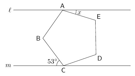 次の図で,五角形ABCDEは正五角形で,$\ell // m$です。このとき,$\angle{x}$の大きさを求め,アに当てはまる数を半角英数字で入力しなさい。