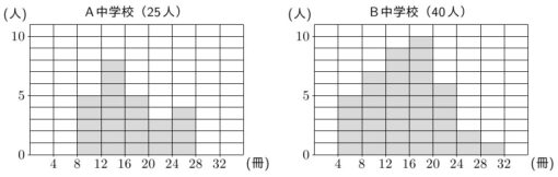 - 借りた本の冊数が12冊以上16冊未満の階級の相対度数は,A中学校よりもB中学校の方が小さい。