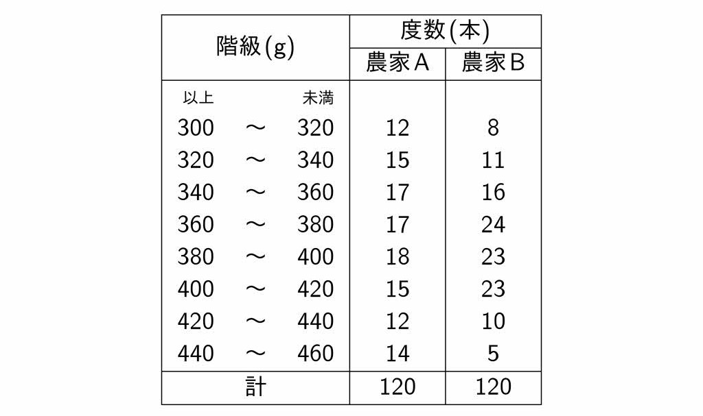 下の表は,北海道の農家Aと農家Bがそれぞれ収穫したトウモロコシの中から,健太さんたちが無作為に120本ずつ選んでその重さを調べ,度数分布表にまとめたものです。