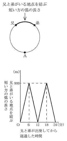 1. はじめに,兄と弟は同時に出発し,2人とも24分で遊歩道を1周しました。兄と弟が出発してから経過した時間と,兄と弟がいる地点を結ぶ短い方の弧の長さの関係をグラフに表すと,上のようになりました。遊歩道1周の道のりは何mになるかを求め,アに当てはまる数を半角英数字で入力しなさい。