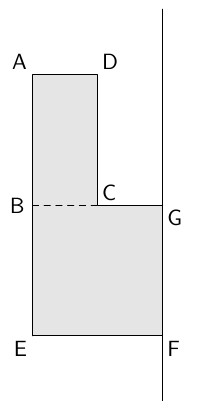 下の図のように,長方形ABCDと正方形BEFGが同じ平面上にあり,点Cは線分BGの中点で,\( \text{AB} =\text{BE} =4 \)cmです。長方形ABCDと正方形BEFGを合わせた図形を,直線GFを軸として1回転させてできる立体の体積を求め,アに当てはまる数を半角英数字で入力しなさい。ただし,円周率を\( \pi \)とします。